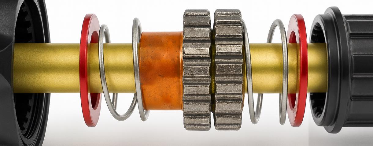 Wymiana bębenka odbywa się z użyciem fabrycznego end-capu dla XDR i Shimano, dla Microspline dodatkowy end-cap (w zestawie). Kluczowe jest zachowanie właściwej kolejności elementów piasty podczas składania, co gwarantuje poprawną pracę mechanizmu (patrz zdjęcie z kolejnością elementów)